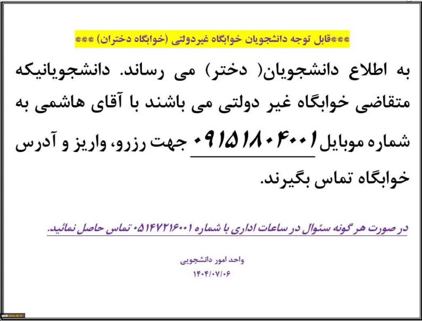 قابل توجه دانشجویان خواهران که متقاضی خوابگاه می باشند.