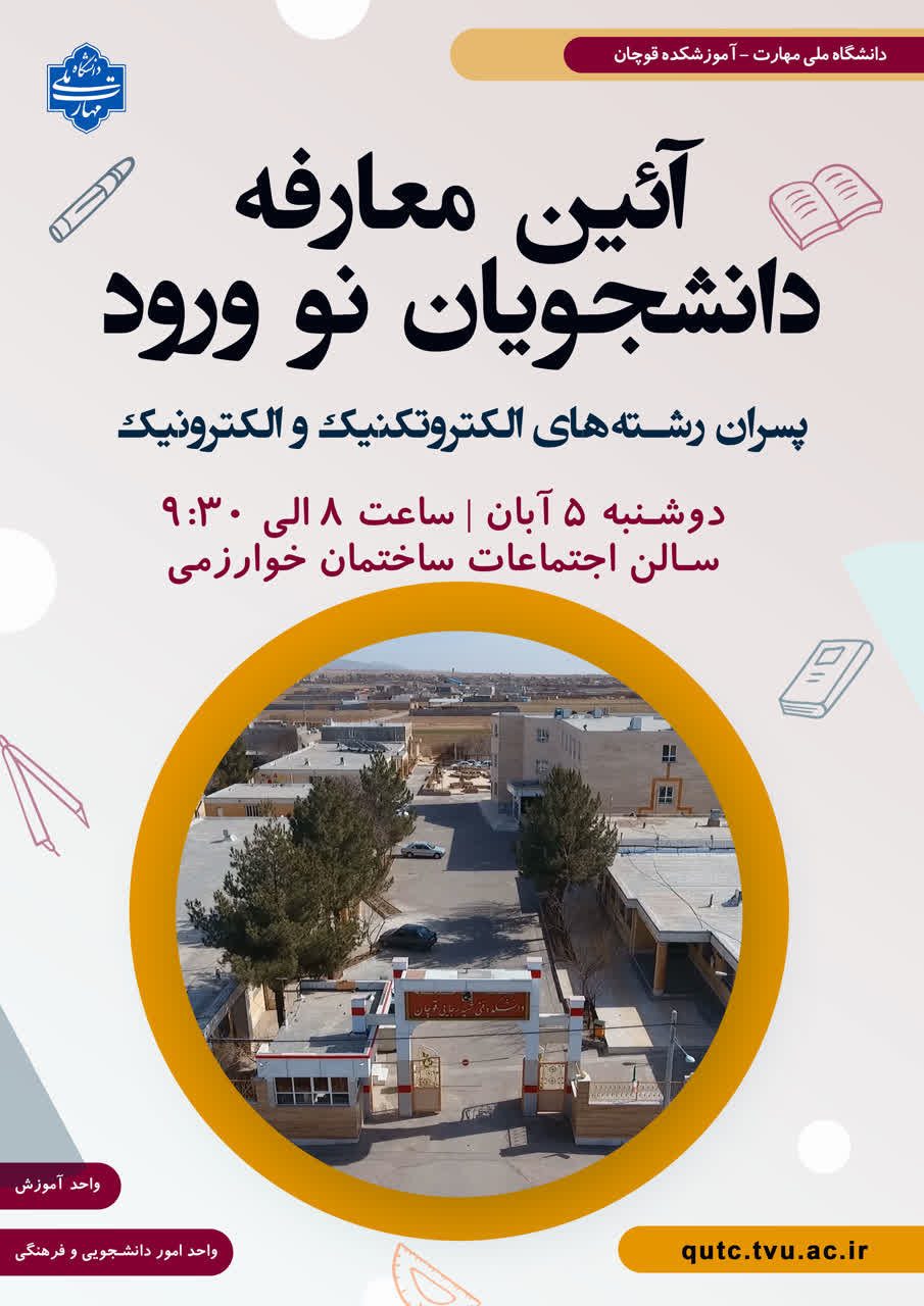 به اطلاع دانشجویان ورودی مهر ۱۴۰۴ رشته های الکتروتکنیک و الکترونیک می رساند جلسه آشنایی دانشجویان با موارد آموزشی و دانشجویی در تاریخ ۵ آبان ماه ۱۴۰۴ ساعت ۸:۰۰ در سالن اجتماعات آموزشکده برگزار می گردد.