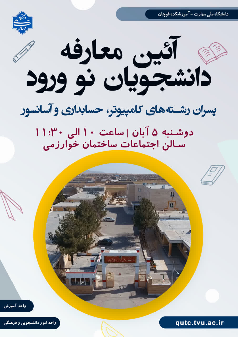 به اطلاع دانشجویان ورودی مهر ۱۴۰۴ رشته های حسابداری، کامپیوتر و آسانسور (پسران)می رساند جلسه آشنایی دانشجویان با موارد آموزشی و دانشجویی در تاریخ ۵ آبان ماه ۱۴۰۴ ساعت ۱۰:۰۰ در سالن اجتماعات آموزشکده برگزار می گردد.