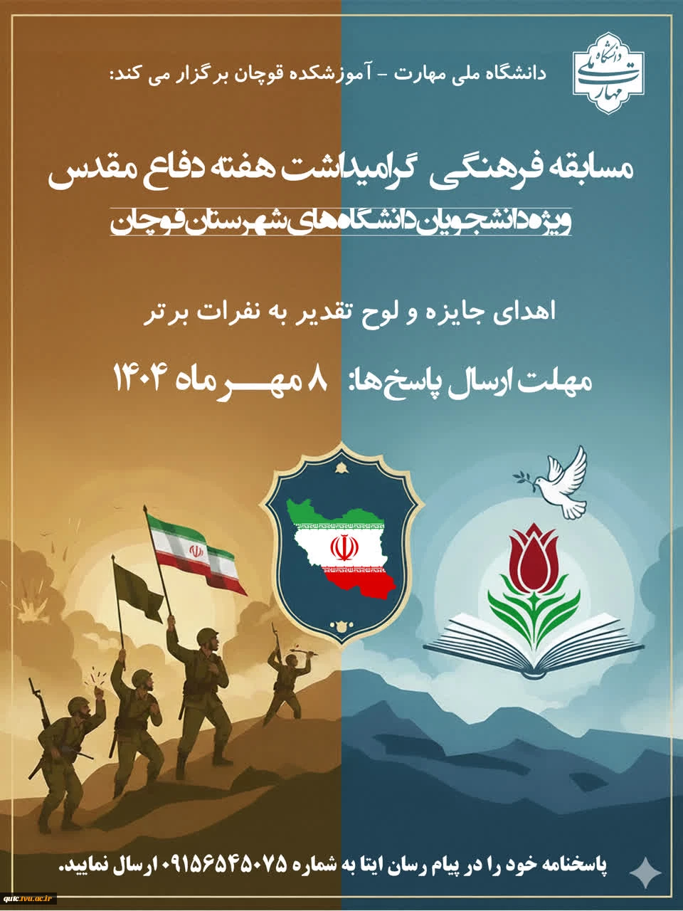 امتیاز دهید : دانشگاه ملی مهارت –آموزشکده قوچان مسابقه فرهنگی گرامیداشت هفته دفاع مقدس ویژه دانشجویان، دانشگاههای شهرستان قوچان را برگزار میکند. 2 چهارشنبه 2 مهر 1404 ساعت 11:24