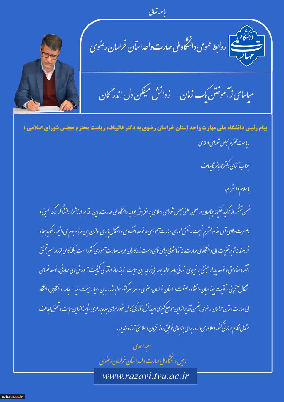 پیام دکتر احمدی، رئیس دانشگاه ملی مهارت استان خراسان رضوی به دکتر قالیباف، ریاست محترم مجلس شورای اسلامی 2