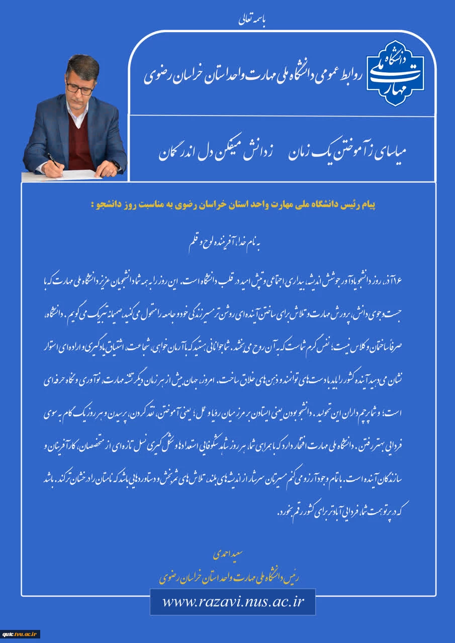 امتیاز دهید : پیام دکتر احمدی، ریاست دانشگاه ملی مهارت استان خراسان رضوی به مناسبت روز دانشجو 2 شنبه 15 آذر 1404 ساعت 14:39