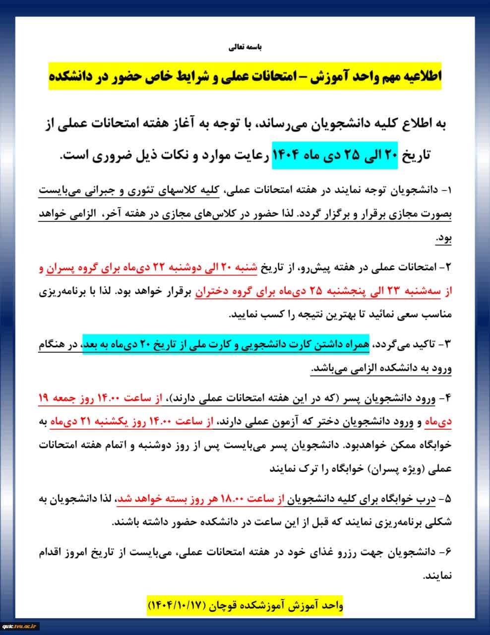 امتیاز دهید : اطلاعیه مهم واحد آموزش – امتحانات عملی و شرایط خاص حضور در دانشکده 2 چهارشنبه 17 دی 1404 ساعت 13:05